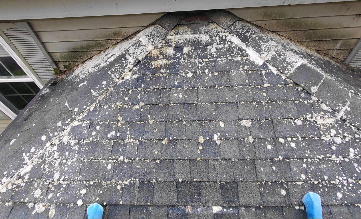 Bright Brothers treated this heavy moss that accumulated on this roof. Our cleaning solution kills the moss completely. Dead moss turns white or gray, and the dead roots will loosen the hold on the asphalt shingles and wear off over time.