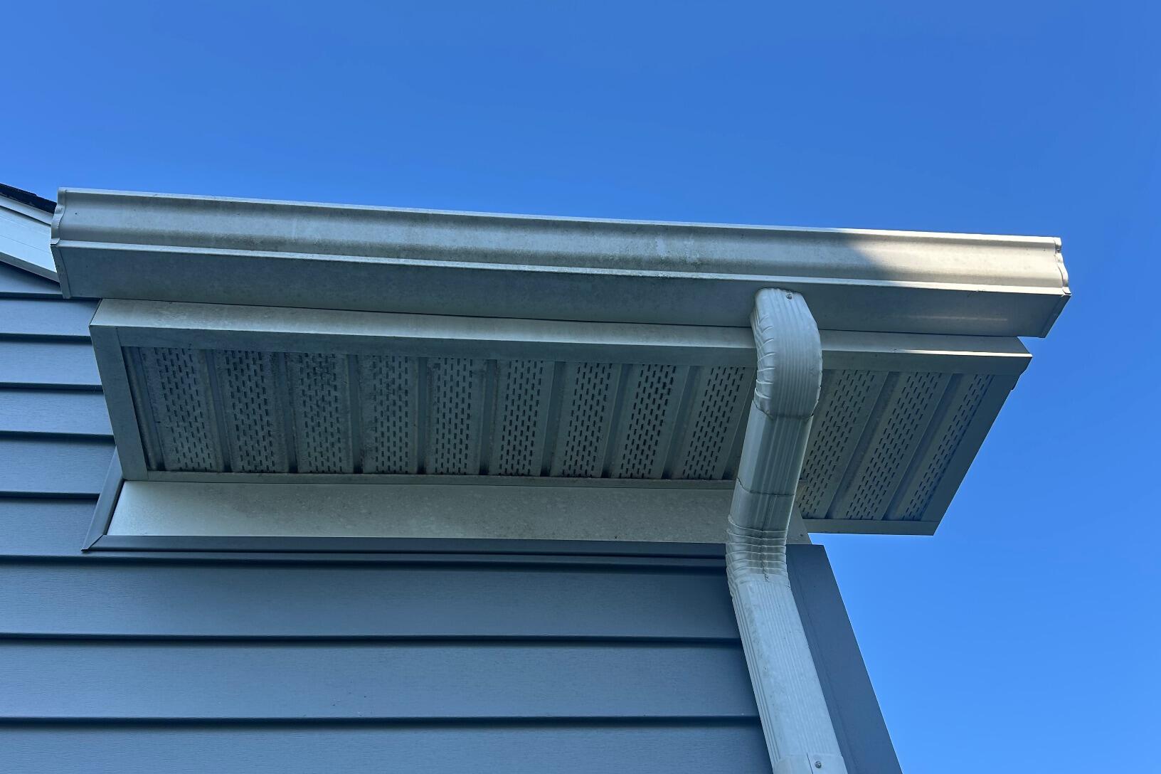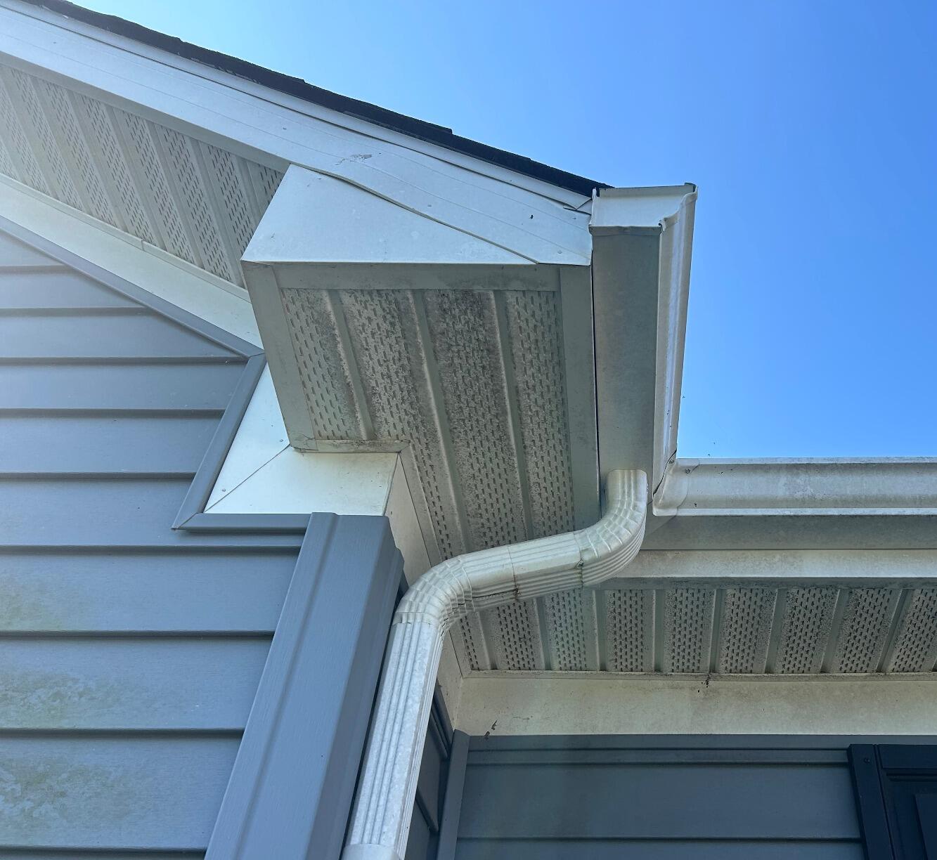 Before gutter brightening, these gutters were covered in built-up grime that left them looking dull and discolored. Using our Bright Stuff Gorgeous Gutters solution, we restored them to a clean, bright white.